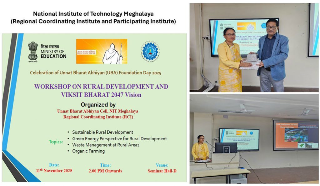 NIT Meghalaya (UBA Cell) organized ORIENTATION WORKSHOP on 7th September 2024 for all the Participating Institutes in Meghalaya via hybrid mode. UG, PG and Ph.D. students were also present in the program. Four invited lectures were delivered related to sustainable rural development, solar energy applications in villages and waste management. Representatives from the Bethany Society Shillong were also present in this event. Dr. Carmo Noronha (Secretary, Bethany Society) gave a talk on sustainable rural development and its related aspects with demonstrations.